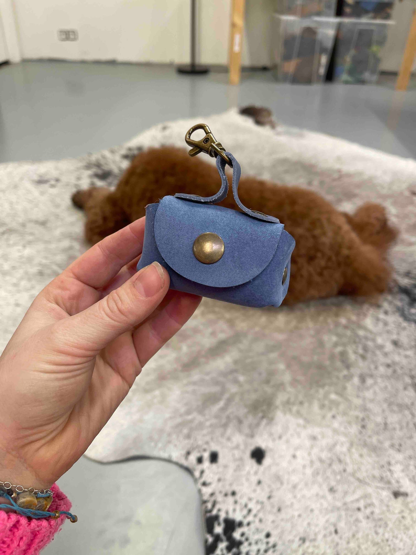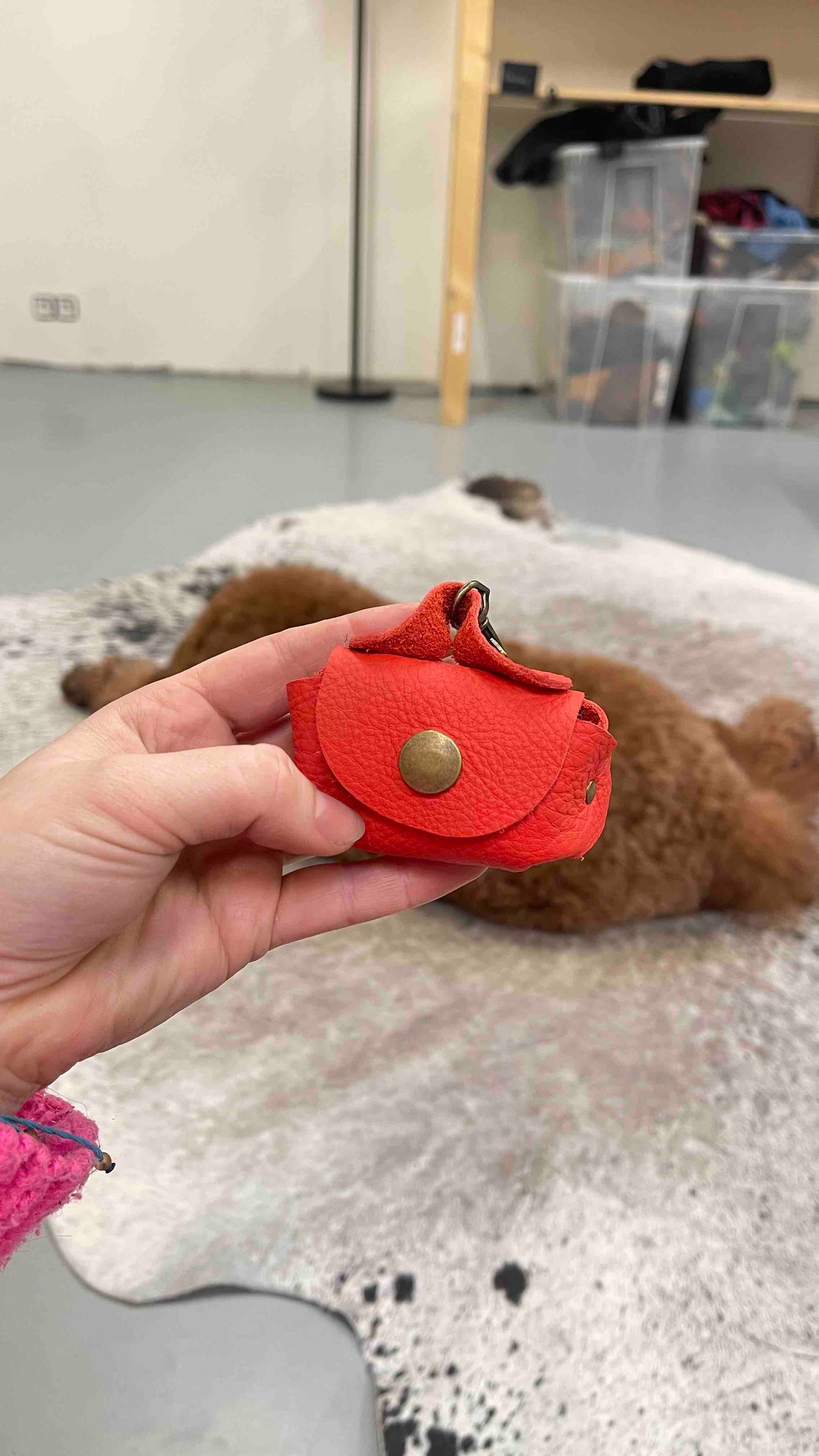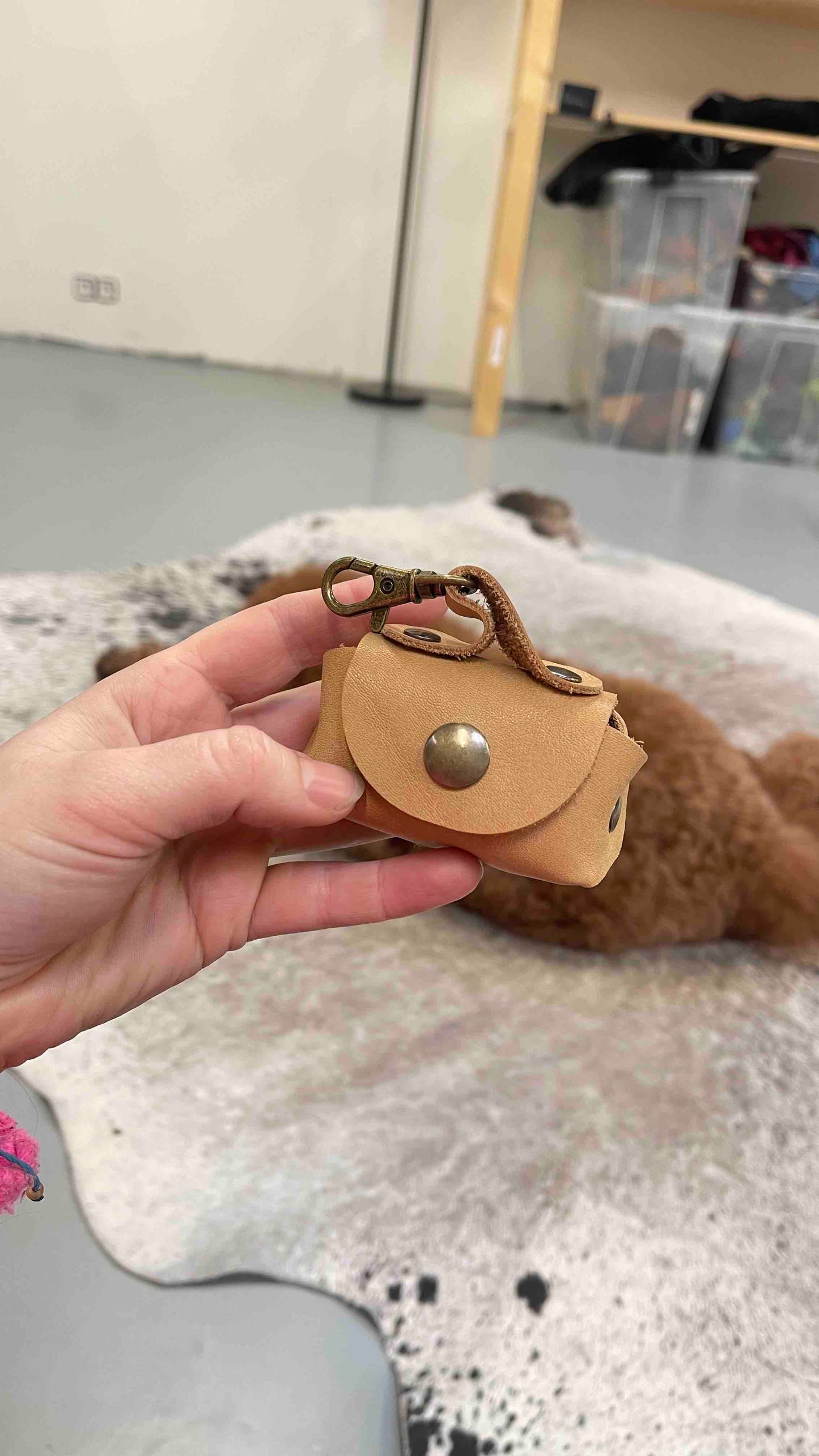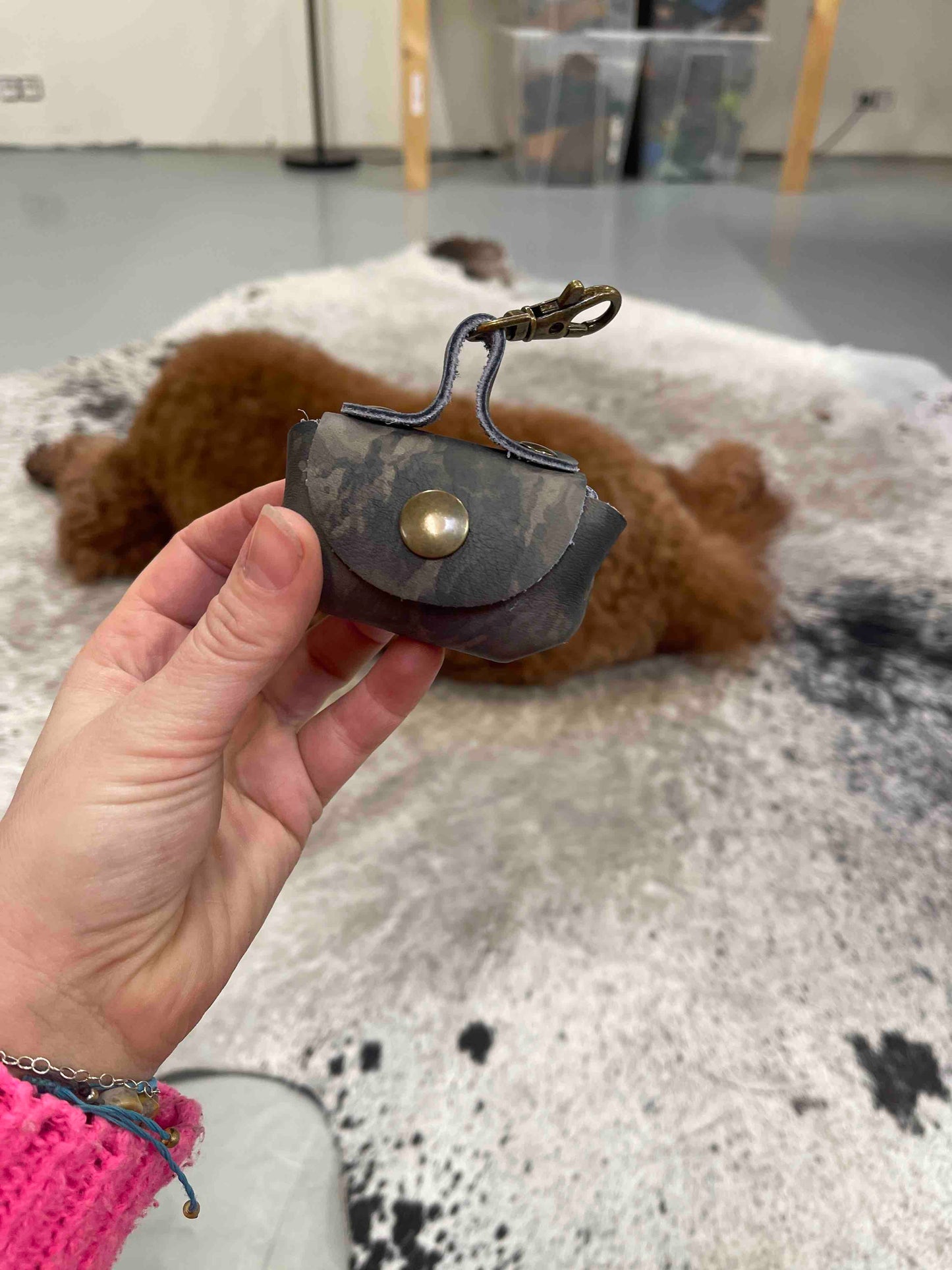 Dit leren poeptasje uitlaattasje is 7cm breed en 4cm hoog en 4cm diep. Gaat dicht met een drukknoop, heeft een gat aan de onderkant om je poeprolzakjes doorheen te trekken en je kunt hem met een musketon aan je lijn, broek of uitlaattas klikken. Helemaal afgewerkt met bronzen fournituren.
