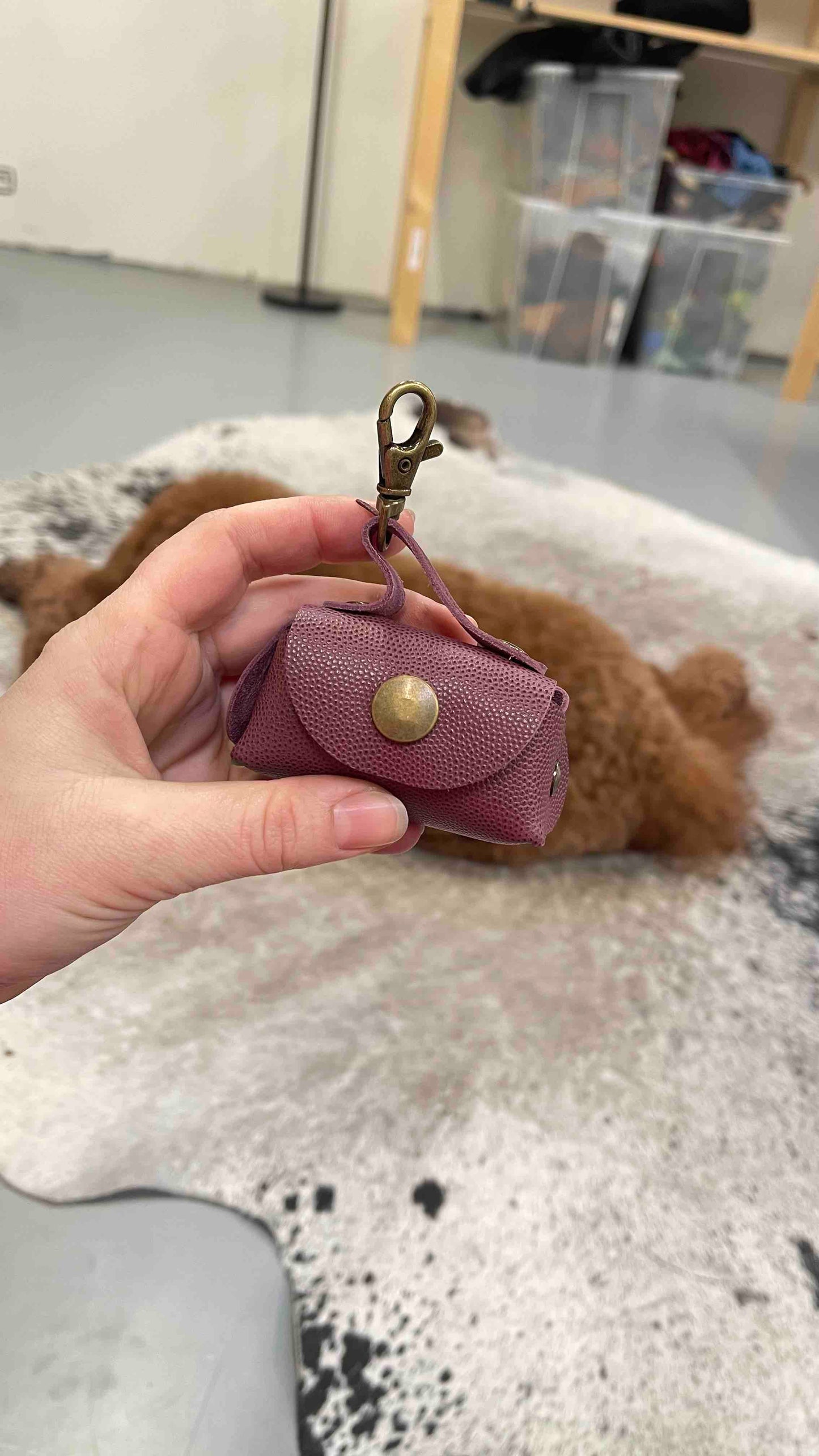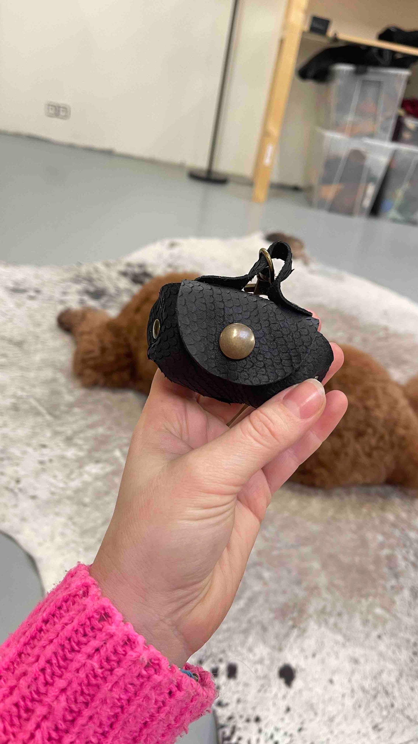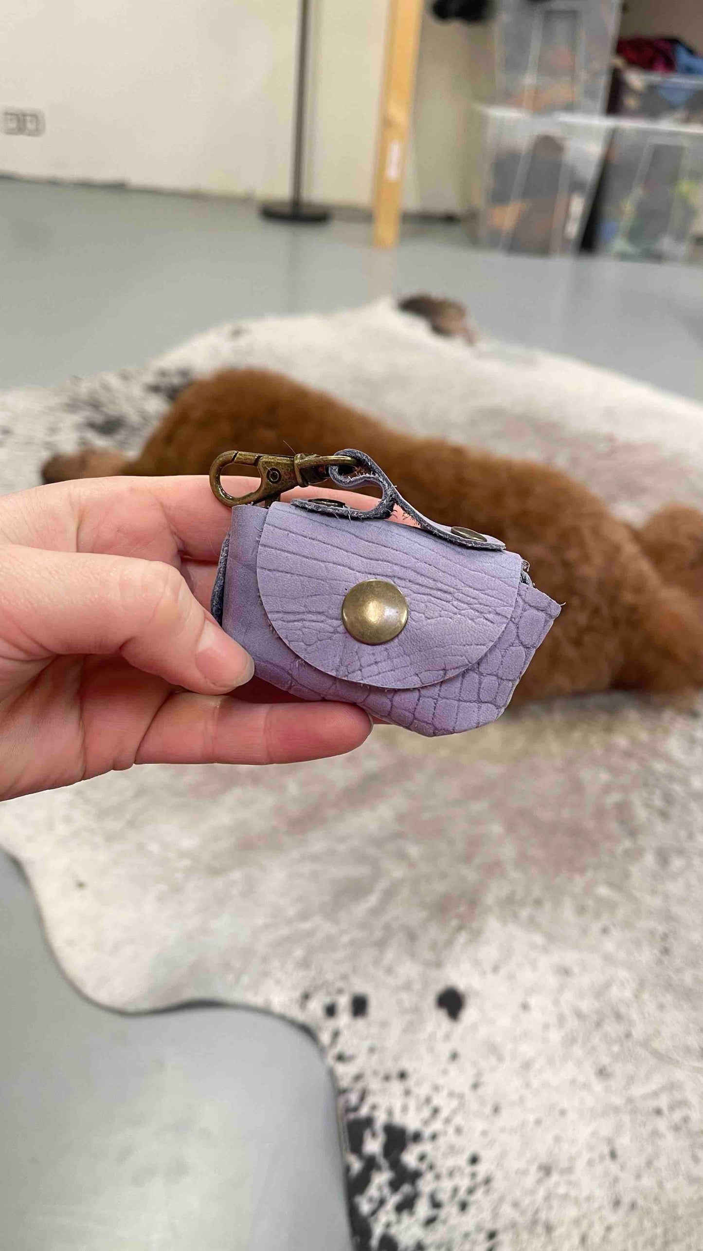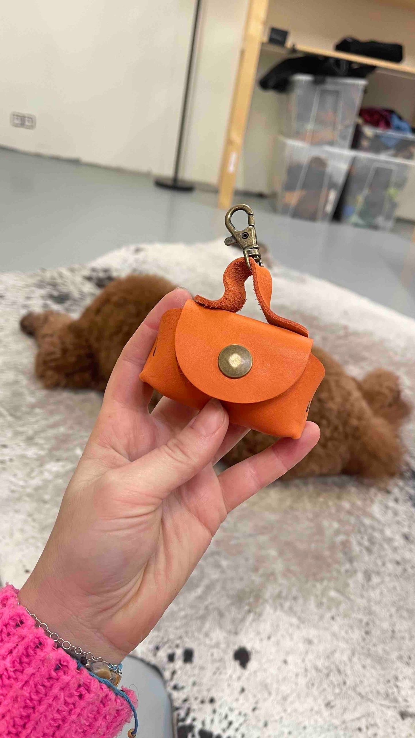 Dit leren poeptasje uitlaattasje is 7cm breed en 4cm hoog en 4cm diep. Gaat dicht met een drukknoop, heeft een gat aan de onderkant om je poeprolzakjes doorheen te trekken en je kunt hem met een musketon aan je lijn, broek of uitlaattas klikken. Helemaal afgewerkt met bronzen fournituren.