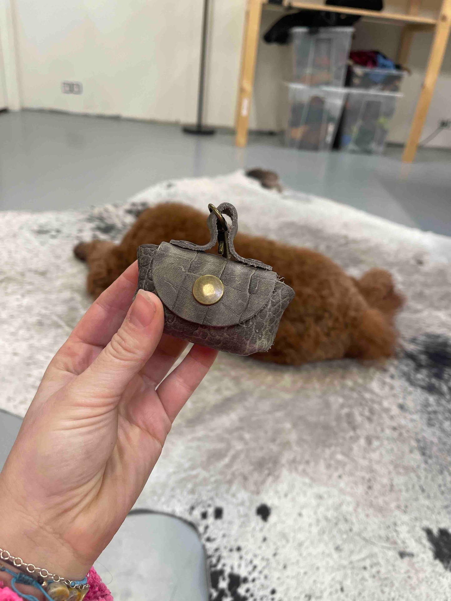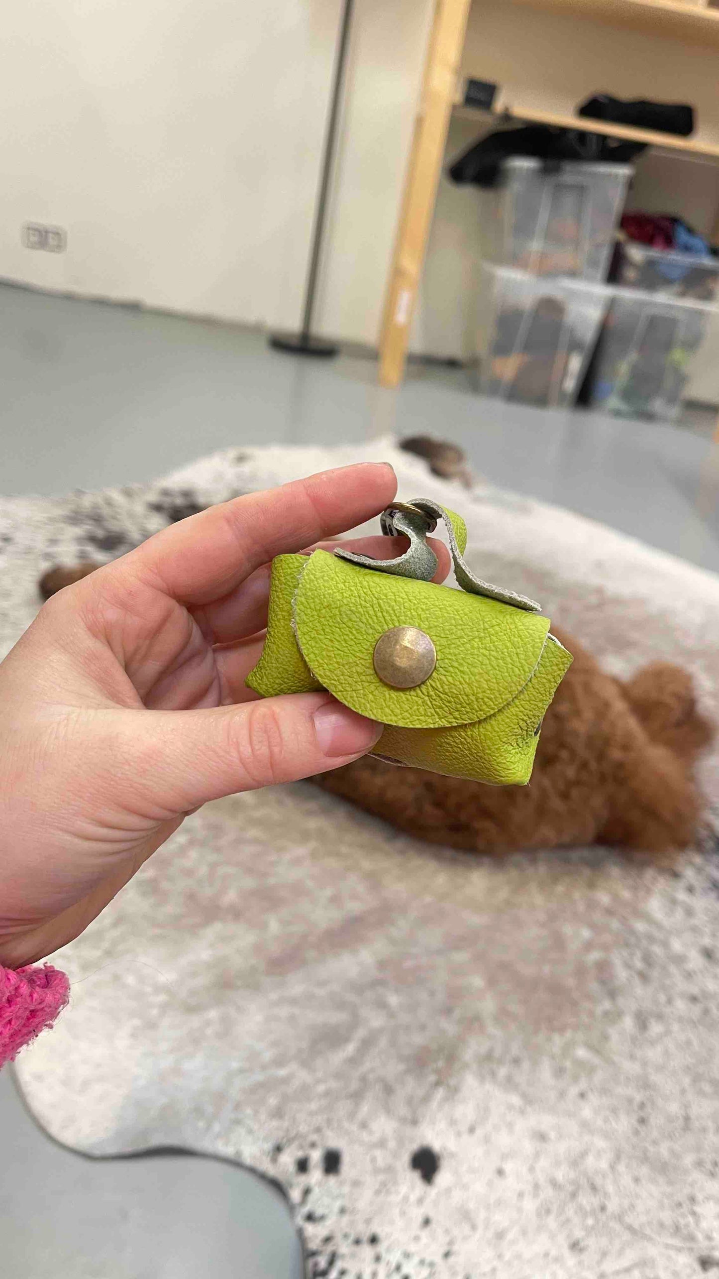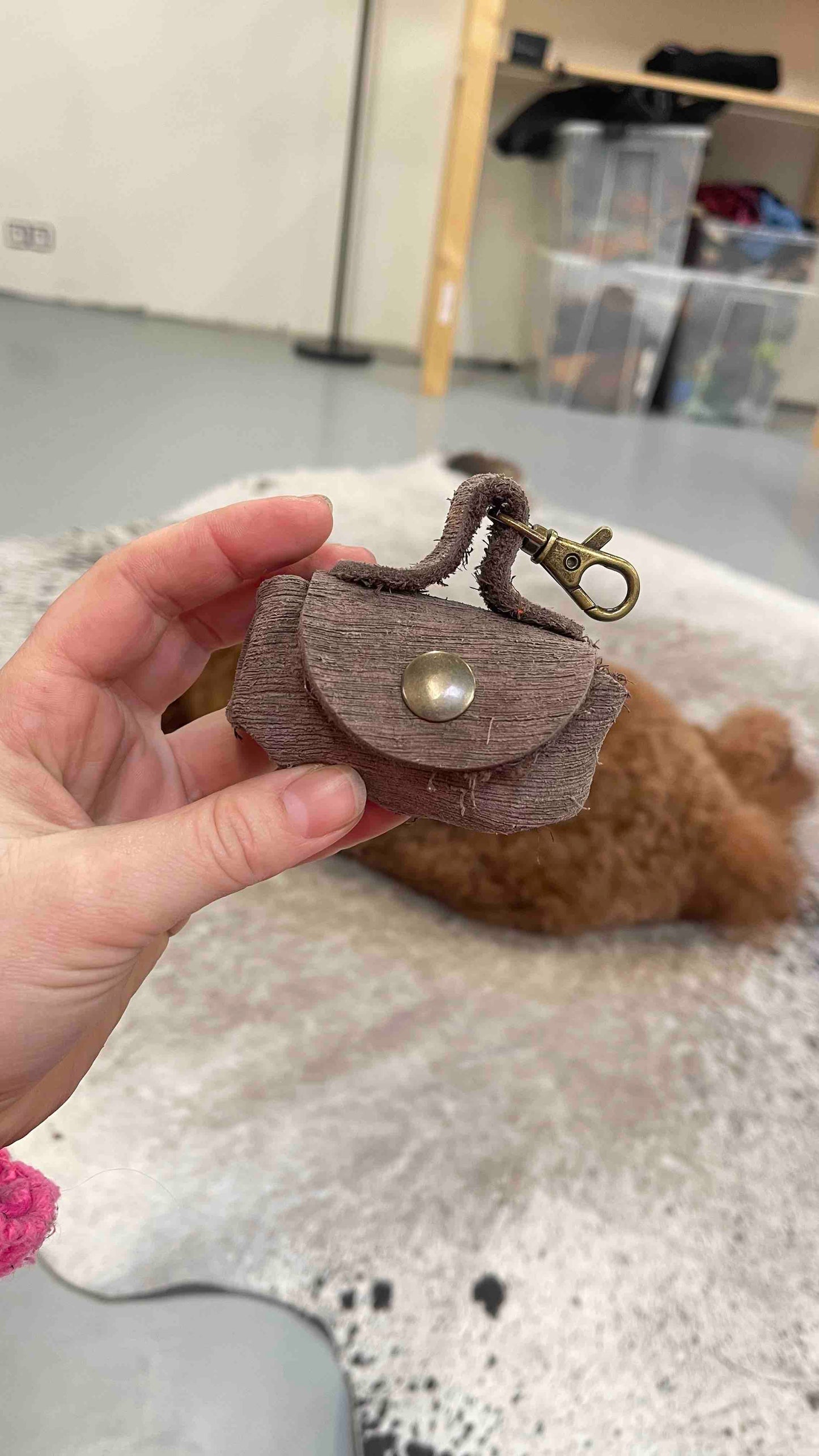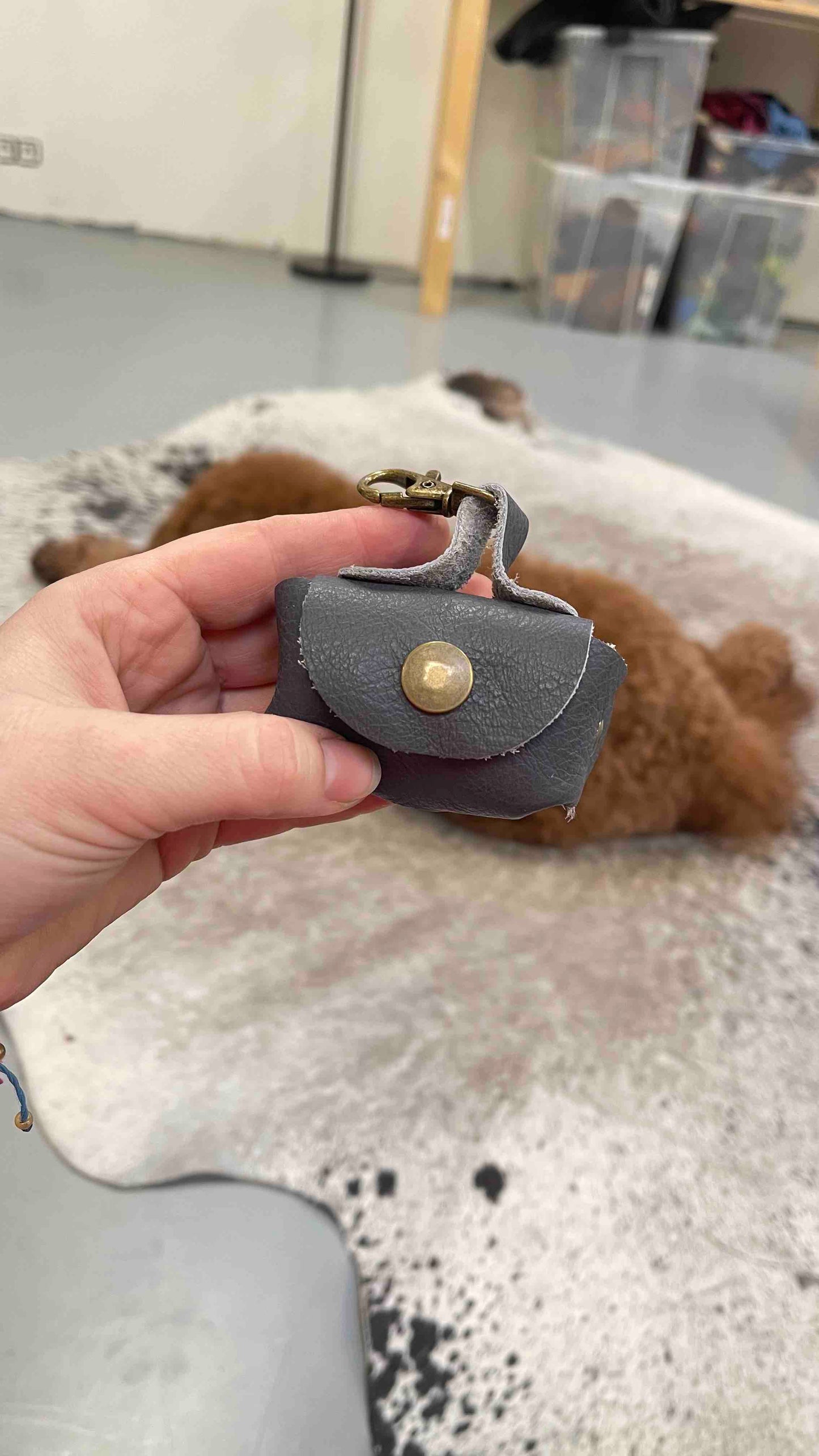 Dit leren poeptasje uitlaattasje is 7cm breed en 4cm hoog en 4cm diep. Gaat dicht met een drukknoop, heeft een gat aan de onderkant om je poeprolzakjes doorheen te trekken en je kunt hem met een musketon aan je lijn, broek of uitlaattas klikken. Helemaal afgewerkt met bronzen fournituren.