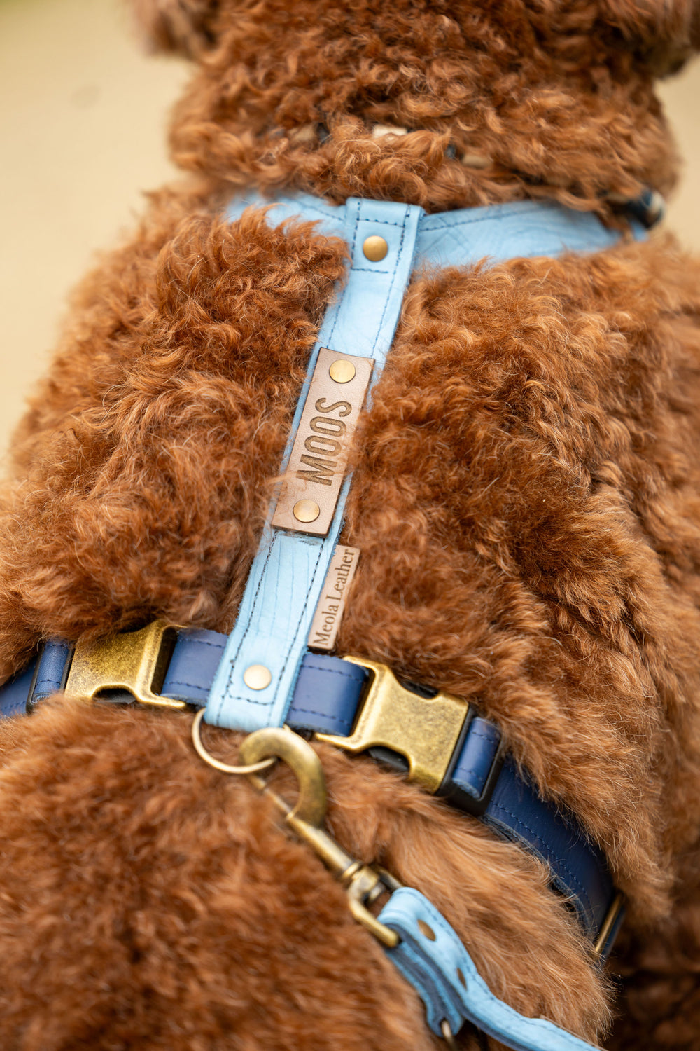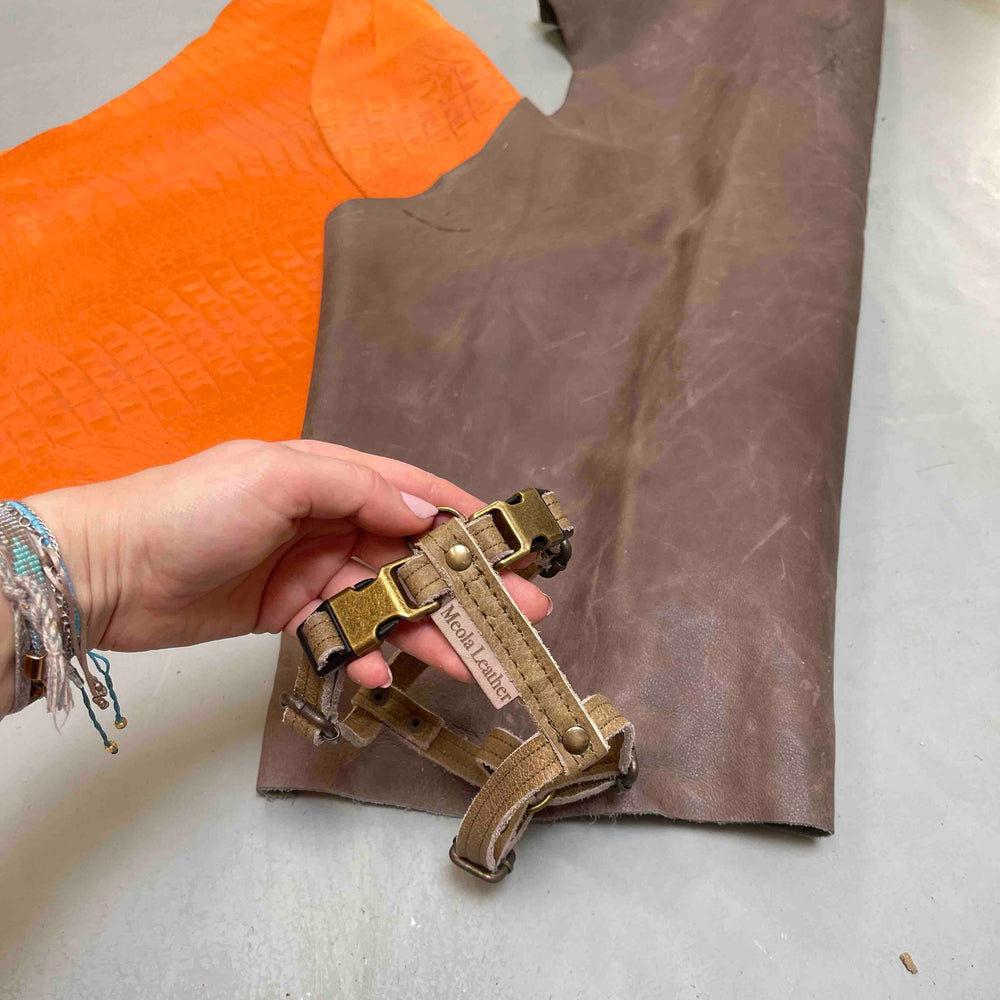 The harness is made of 2 layers of leather that are stitched together, this provides extra strength and helps prevent stretching. This does not mean that the harness is made of stiff leather, far from it. I always make sure that the harnesses are made of nice supple, but sturdy leather. The harness has bronze fittings, is finished with matching stitching and opens with click buckles. We are in love with this system, because it is sturdy and also beautiful.